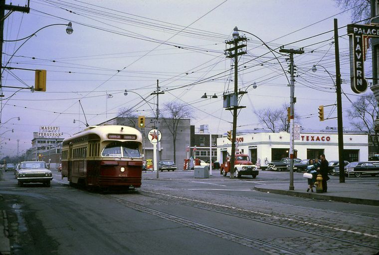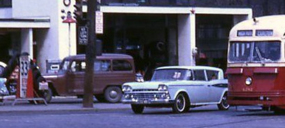 Another view of the intersection of College and Dundas this one with 4282 westbound with a Rambler next to it and a brown Willys Jeep station wagon at the service station where gas was selling for 33.9c per gallon! Behind the PCC is a local tow truck and a canvas topped truck. 10/1962 Paul McGrane Collection