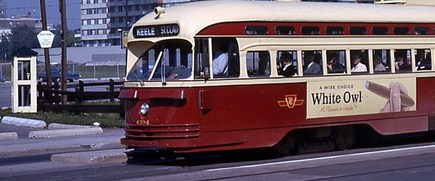 4394 a St.Clair route car destined for Keele Street western loop. Interesting is the White Owl cigar advertisement a popular inexpensive smoke. 10 cents! Also, the telephone booth (remember those?) painted in non-Bell Telephone Company colours likely for Loblaws grocery supermarket (out of view to left) just east of Bathurst Street at Nordheimer Ravine . Still there! 9/1963 Paul McGrane Collection