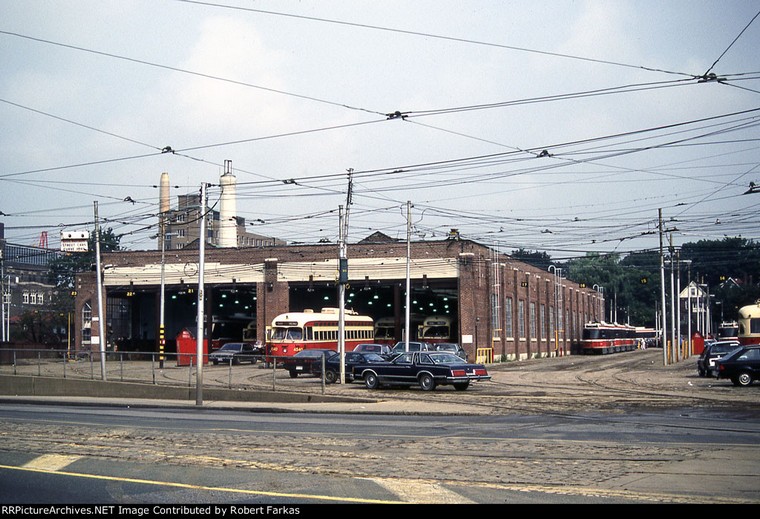 4393 a Bathurst car destined Church heading south at Bridgman Avenue about to pass through subway (underpass) beneath CPR tracks.passing TTC Hillcrest main shops. Car will turn left at Front Street West and proceed east past Union Station to Church Street. Barely visible at upper right is a sand car just leaving TTC yard. 7/31/1965 Paul McGrane Collection