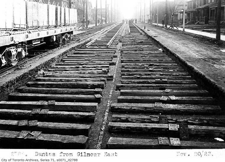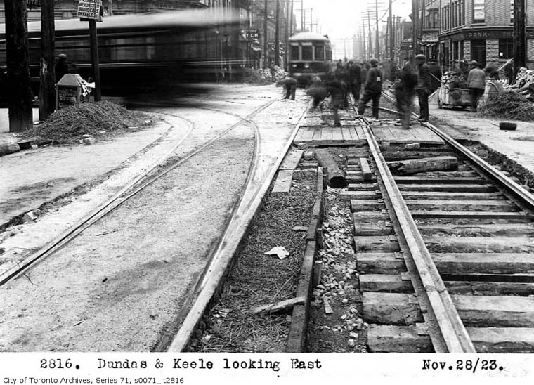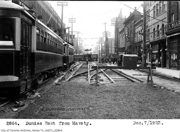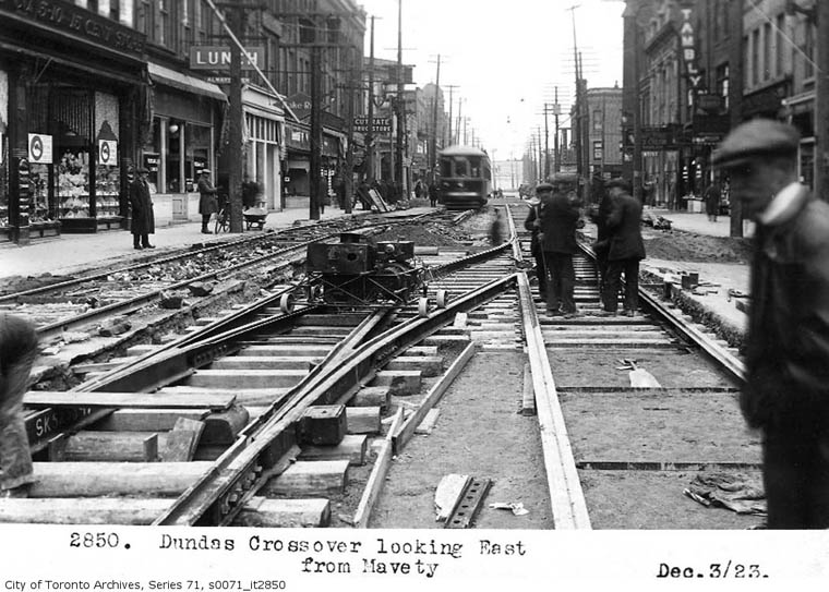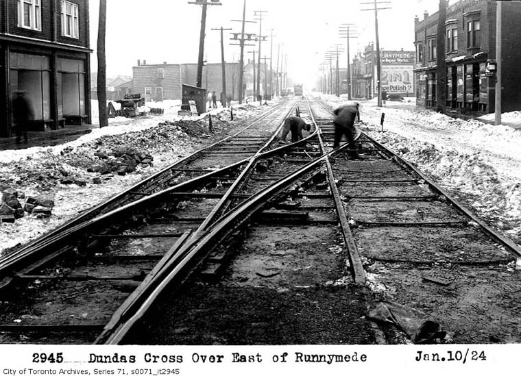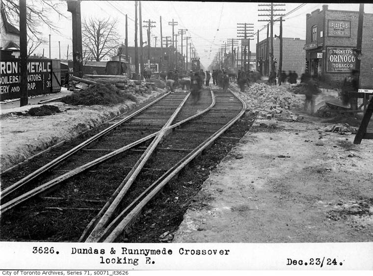 Not in fact a crossover, it is the point where line goes from single to double track. Note ad for Tuckett's Orinoco tobacco and smaller Player's cigarette ad above it at right on corner of Beresford Avenue.