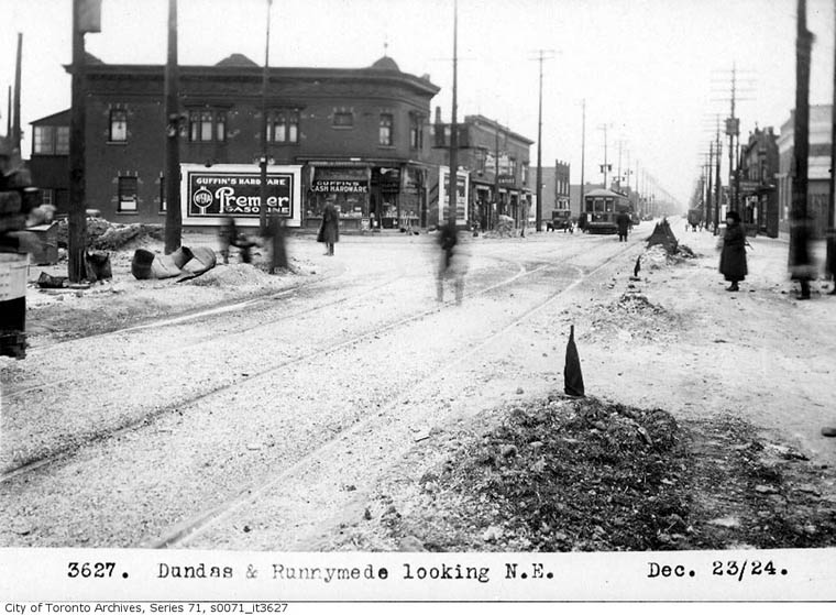 Note Guffin's (Cash) Hardware on the north east corner which sold Imperial Oil's Premier gasoline from a pump on sidewalk at curb to left of sign, something common at the time. Rexall Drug store next door relocated to that corner location and operated into the 1960's as Runnymede Pharmacy. Guffin later relocated on the south side next to the bank on the east corner. The name and location continues to this day. (April 2007) Ten days later (below) it was winter!