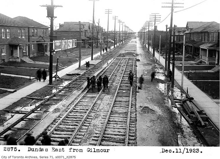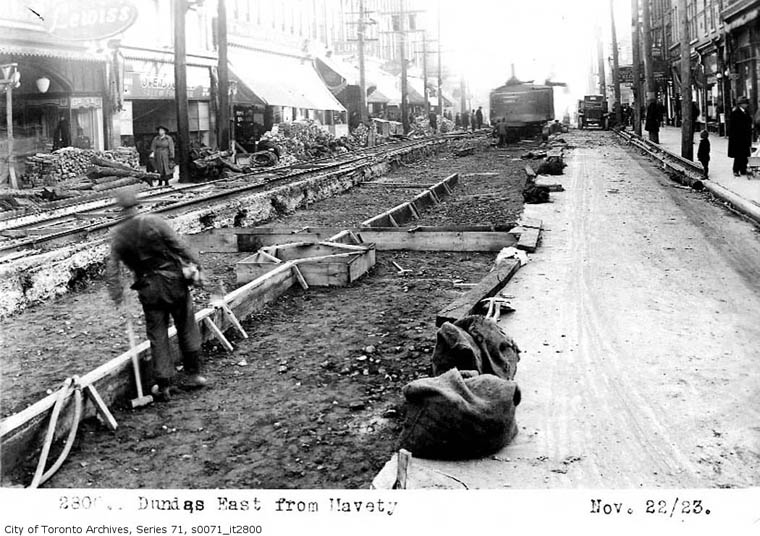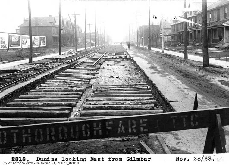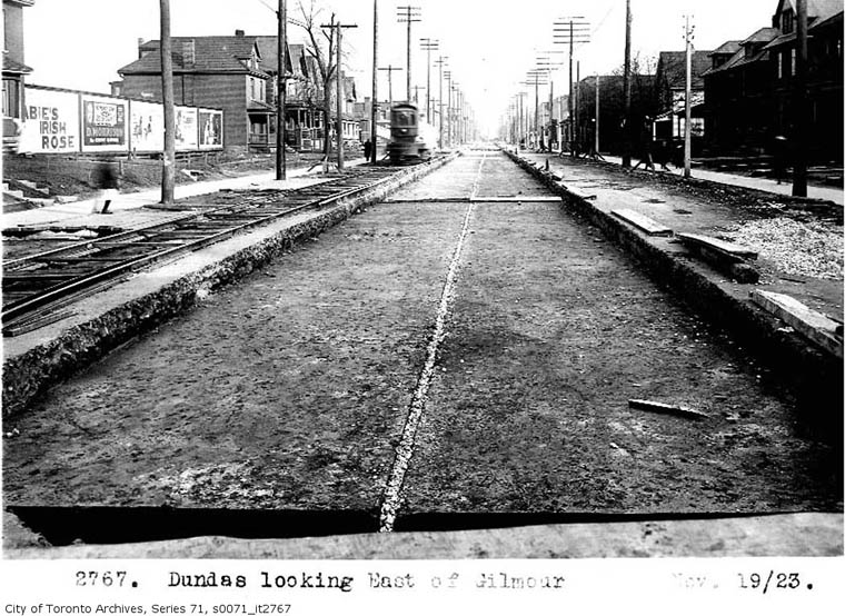 Five earlier views of construction with temporary track at side of the road east of Gilmour Avenue.