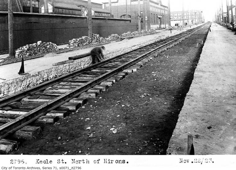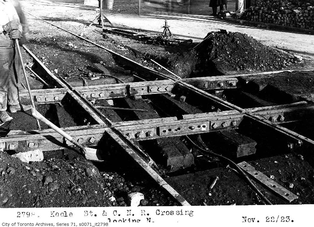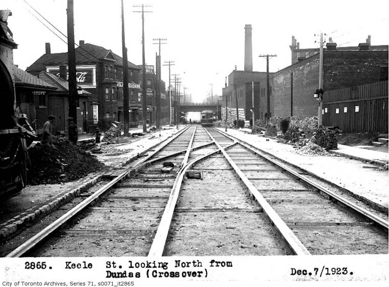 Crossover allows double-ended cars to return north as seen here. Heintzman piano factory at right. Note style of street light. Public lavatory at left. Try and find one of those today! Subway Hotel at corner of Vine Avenue and planing mill opposite.