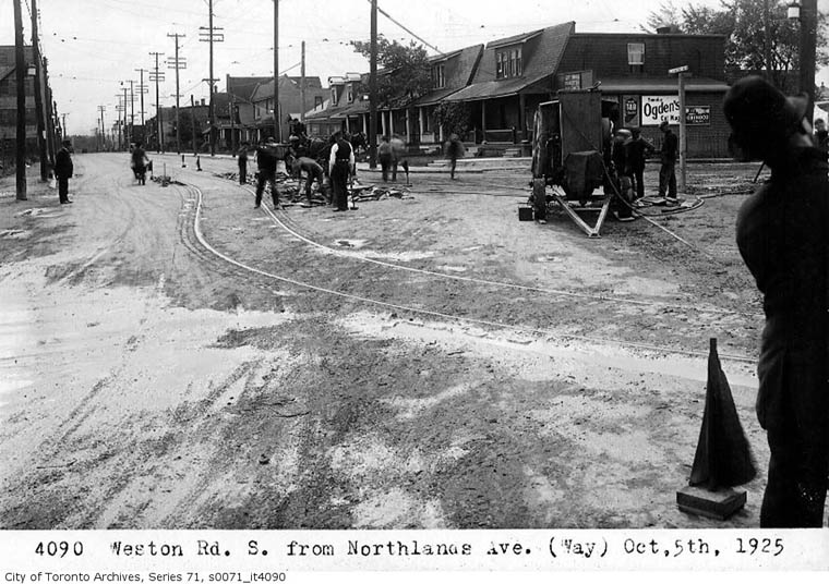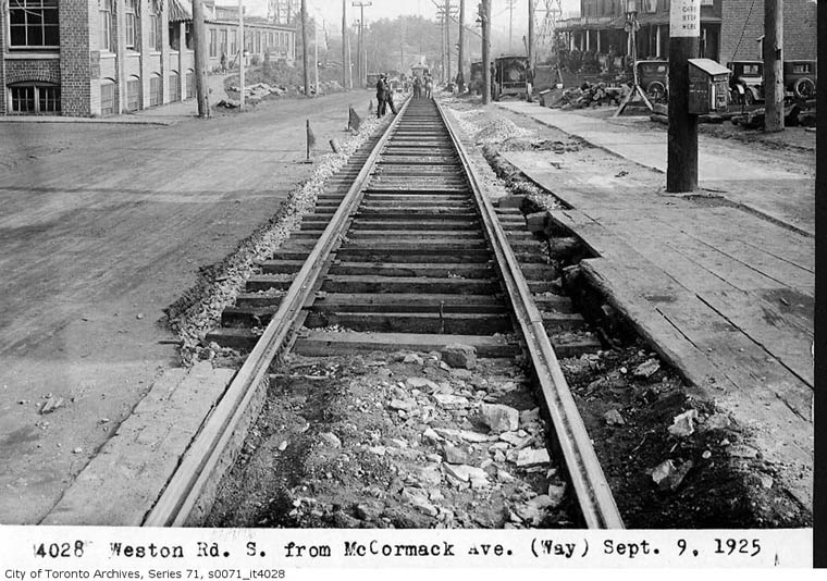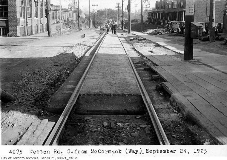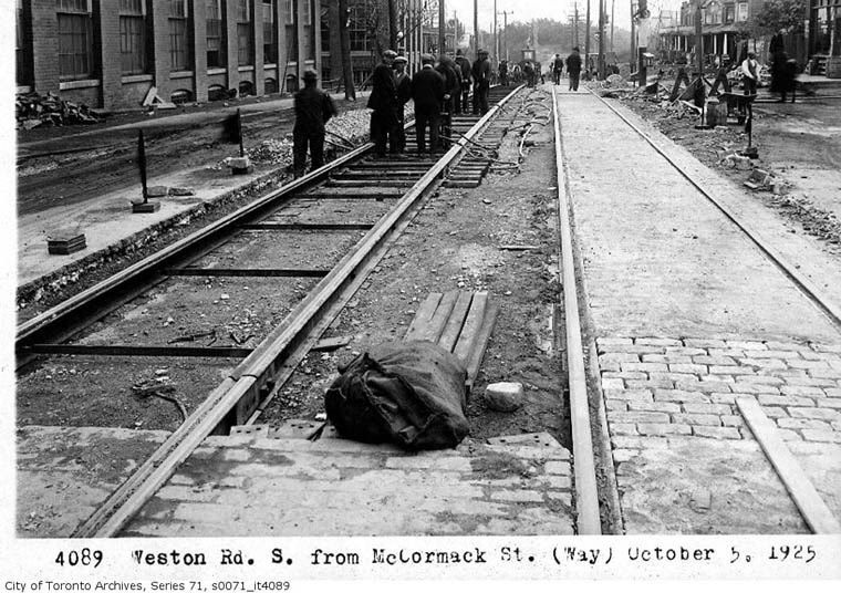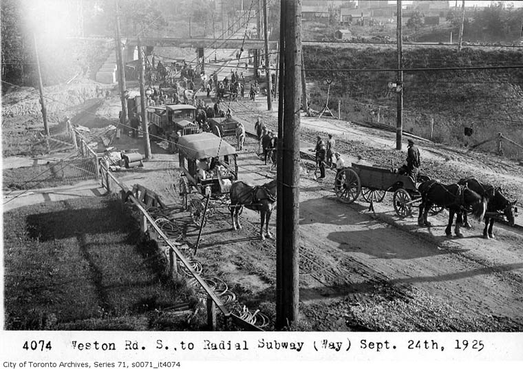 Horse drawn wagons and carriages plus "horseless" vehicles crowd the road while work on track continues. Farther south this road becomes Keele Street. |