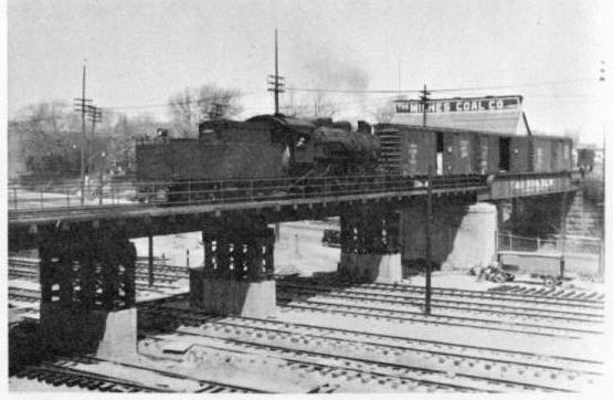 CNR 8357 0-8-0 eastbound on Belt Line, engine on new bridge over TTC Davisville Yard (not yet open) with box cars on old bridge over Yonge Street. July 1953 Don Mc.Cartney