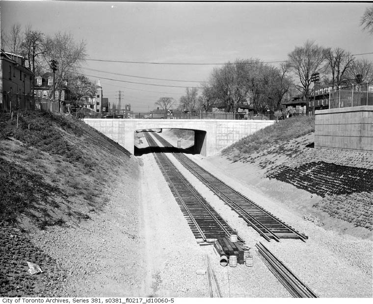 Tracklaying in open cut. Very similar looking to regular railway track and right-of-way. October 30, 1952