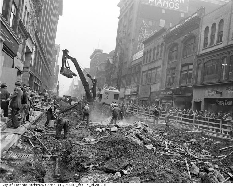 Yonge Street just north of Queen September 28, 1949. This scene and many more like it became commonplace to Toronto citizens for many months. Can you imagine this happening to-day? The vast number of onlookers soon became know as "sidewalk superintendents"! Makes you wonder if anybody was at work! This was a Wednesday and many stores closed back then. Many offices worked a half day on Saturday until 1.00 P.M.before the five day work week became standard. On Sunday virtually everything was closed! |