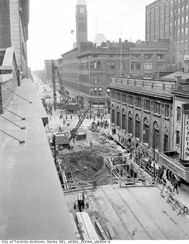 Not only did construction completely disrupt Yonge Street in sections it also disrupted cross streets such as Queen as shown here at Yonge looking west. City Hall clock tower in the distance. May 10, 1950 |