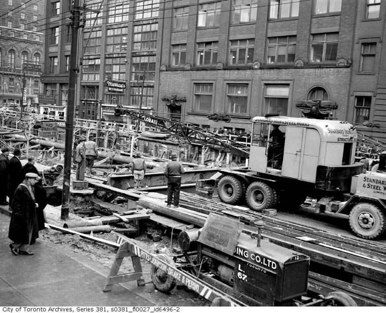 The complexity of the work is evident here and the disruption to businesses obviously considerable. One such business is seen here on Bay Street just north of Front, Murray's Restaurant, a landmark restaurant, an affordable place to eat and just about the only place in downtown open late, late being about midnight or 1-2 A.M. January 25, 1950. |