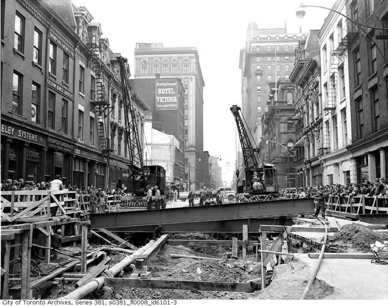 An incredible amount of "Sidewalk Superintendents" oversee placement of steel beams by two cranes. October 18, 1949