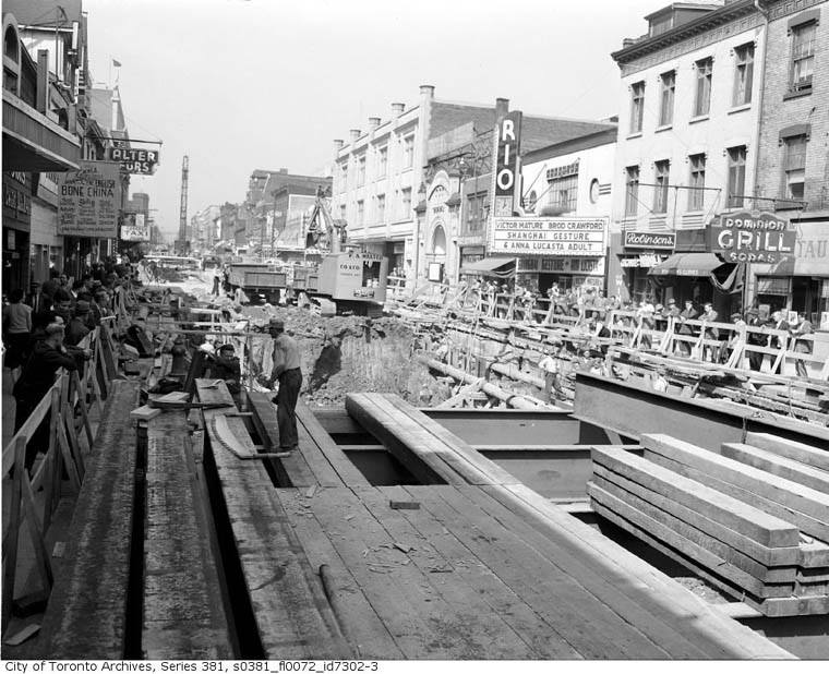 Relocating underground utilities was a big part of this major construction work. Yonge above Dundas. September 2, 1950 The Rio theatre at 373 Yonge Street was one of the many businesses affected by this disruption.