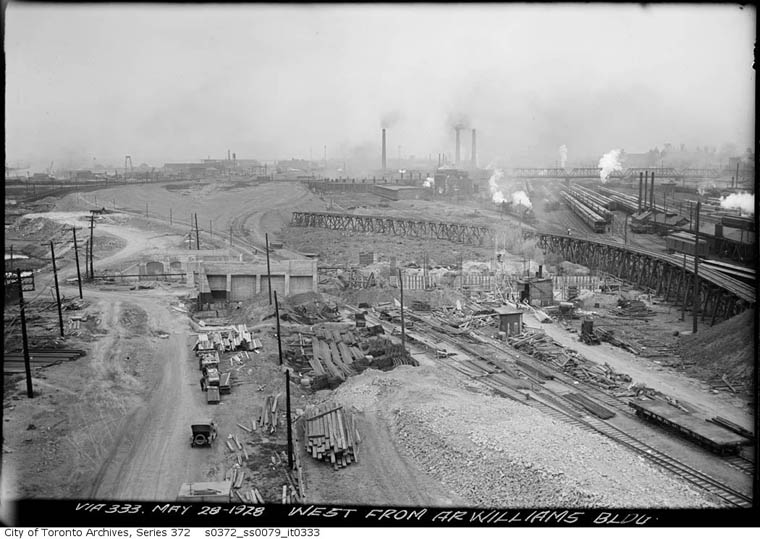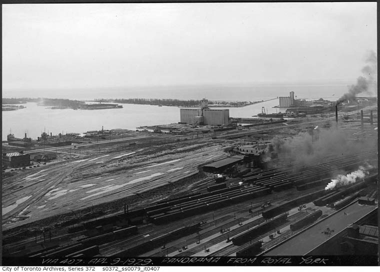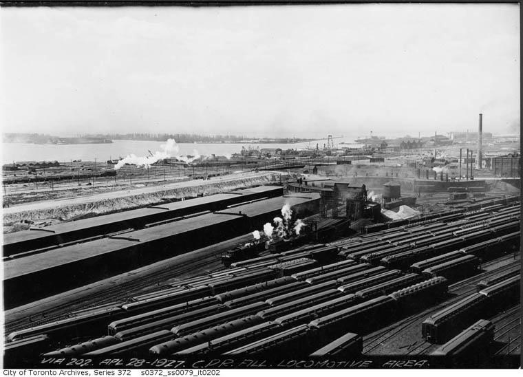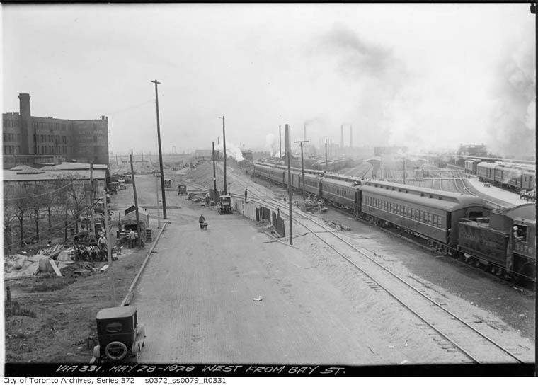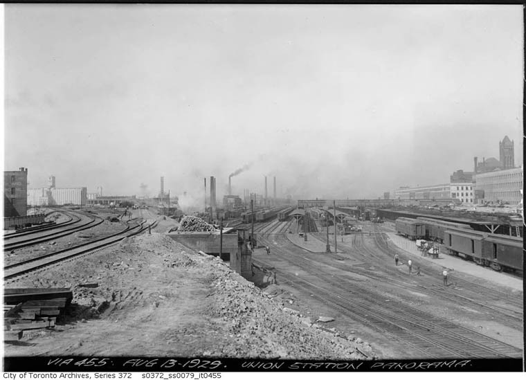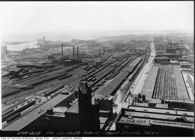 View to the west looking along Front Street West with old TTR Union Station in left foreground, CPR John Street roundhouse and coach yard at far left, CNR Spadina roundhouse farther west with city of Toronto John Street pumping station in between. CNR freight shed at right.