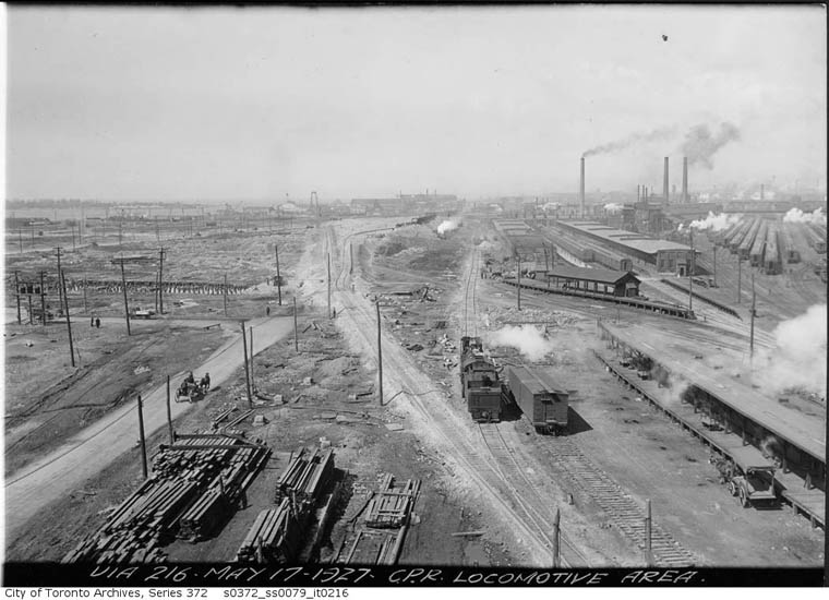 Close up of old CPR John Street roundhouse, coach yard and freight sheds.
