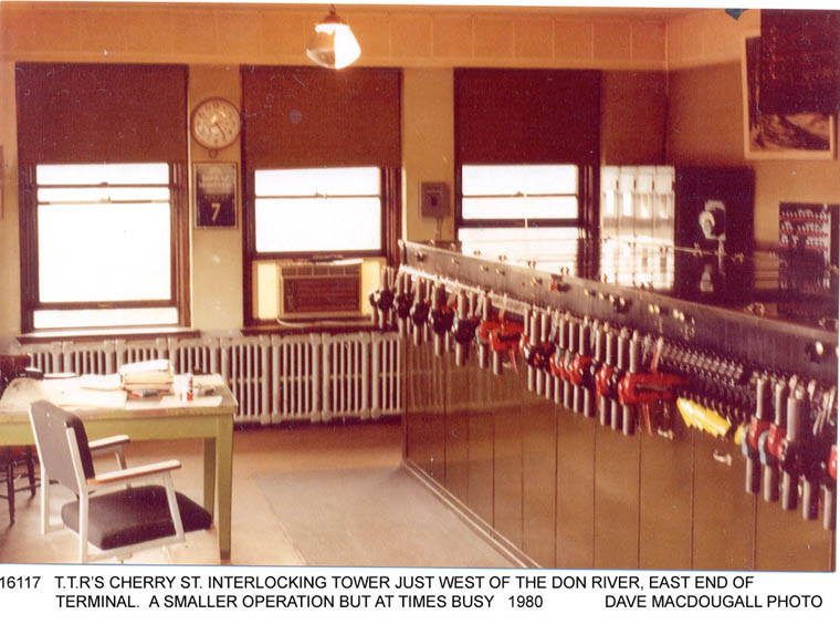 Cherry Street interlocking tower with eastbound GO 701, April 1988. John D.
