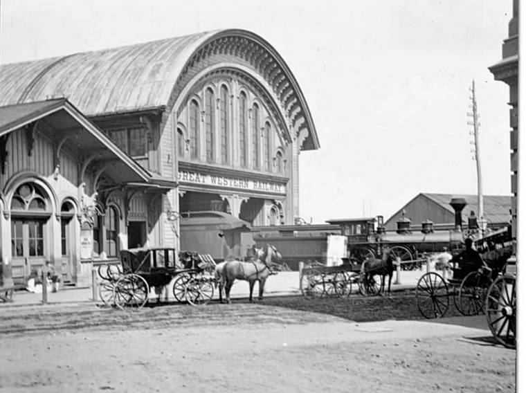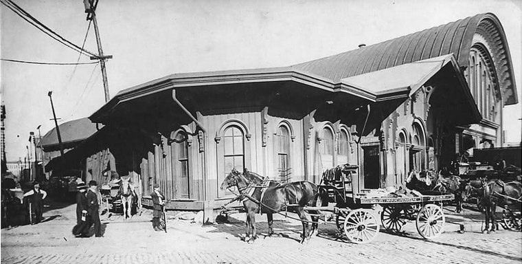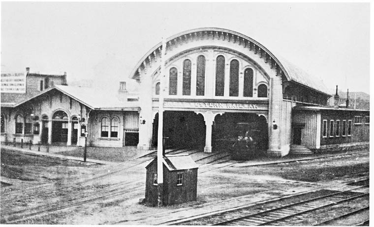 The Great Western built a branch from Hamilton under the charter of the Toronto and Hamilton opening it December 3, 1855. This is the only known photograph of Great Western's Toronto station at Esplanade East and Yonge Street in operation taken shortly after it opened March 2, 1866. Train shed measured 64 feet wide with four deadend tracks. Overall the structure was 311 feet 6 inches by 150 feet with adjoining freight shed (188' x 47') in all costing $20,000 not including the land which the city provided free following complaints about the poor location of the original GTR station used by GWR and NRC on the Esplanade West between York and Simcoe Streets. Looking east. GTR tracks in foreground. All tracks were Provincial (broad) gauge at this time. Following amalgamation on August 12, 1882 with the Grand Trunk the station was closed on the August 28th. re-opening on the 31st. as a bonded freight shed. It closed when new sheds were opened in 1904 at Front & Simcoe Streets after which it became the Toronto Wholesale Fruit Market until destroyed by fire May 17, 1952. The O'Keefe Centre was built on the site. Toronto Reference Library. | ||||||