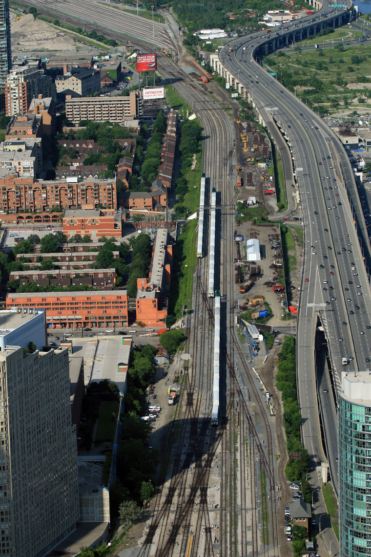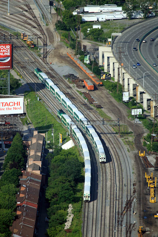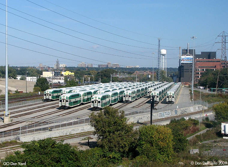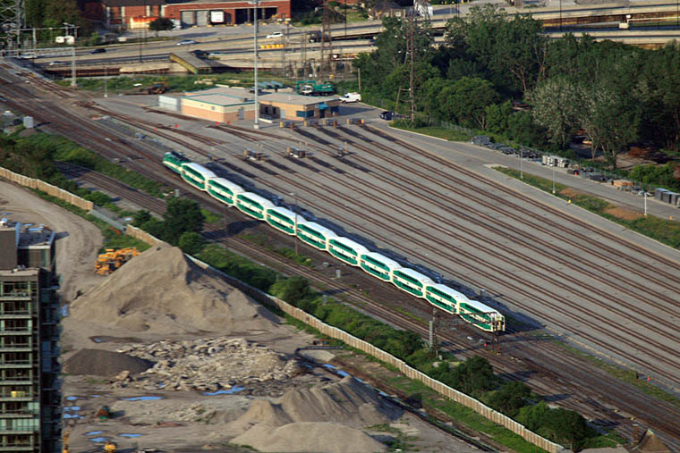 Farther east is the newly rebuilt GO yard on the site of the former CNR Don Yard. Empty, it is used for mid-day layover of rush hour trains. Four stub tracks and six regular tracks. GO train passing on the mainline.