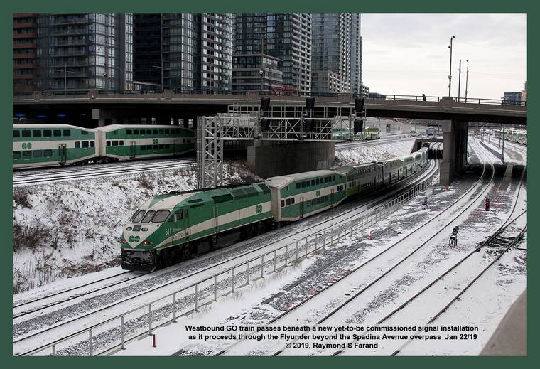 GO 611 shoving westbound towards flyunder beyond new footbridge. View in opposite direction is below.