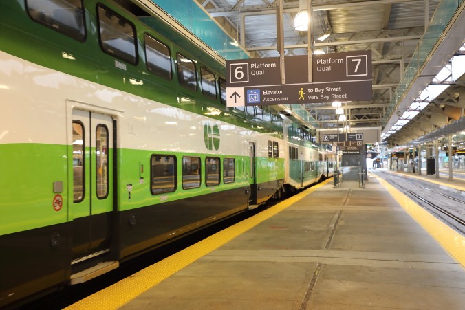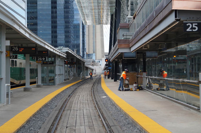 Looking west at track level. Track 13 platform 25 at right and 26 on left. GO train is sitting on track 14 platform 27.