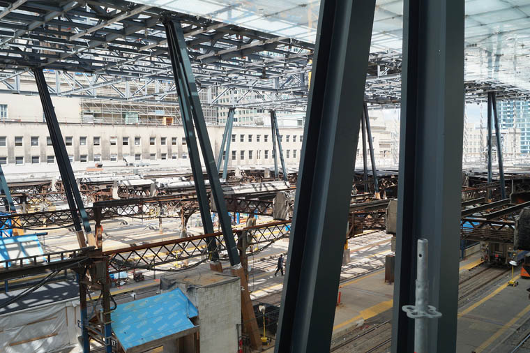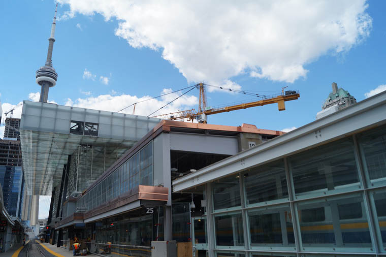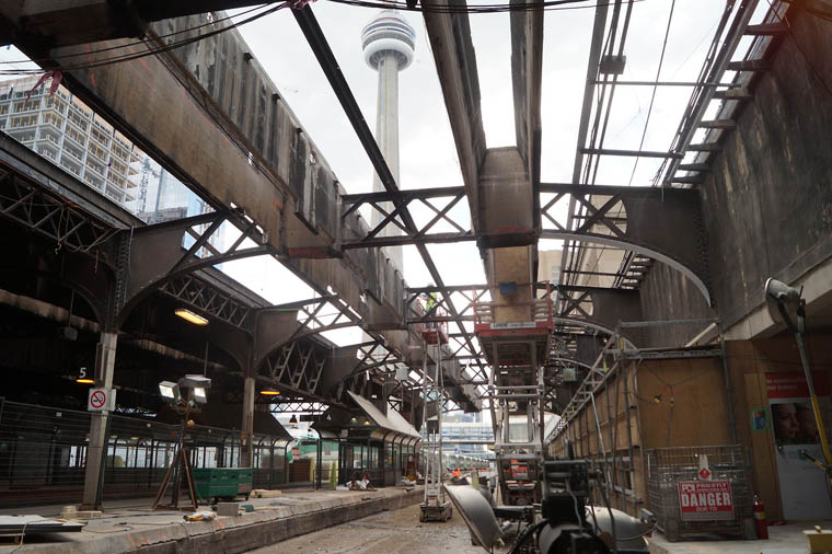 New shed roof extends over track 13. Looking west. Note CN Tower in background.