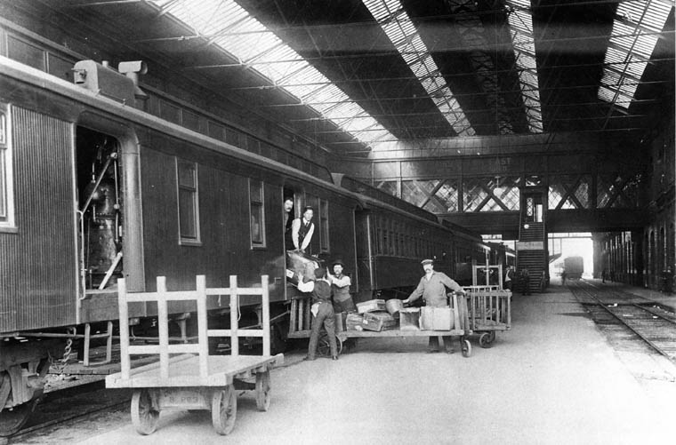 LEAVE FROM THIS SHED. The sign at the foot of the staircase indicates that Tracks