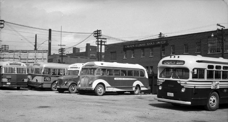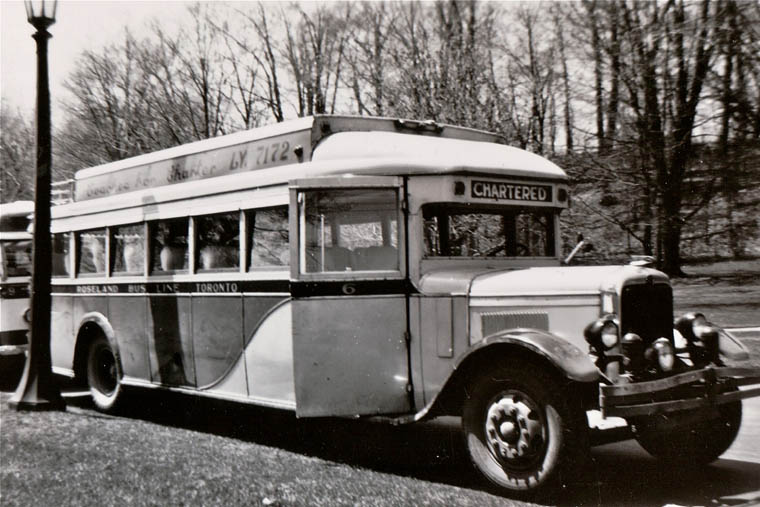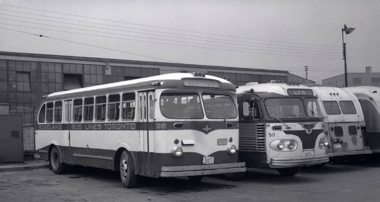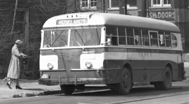 NOTE: Final acquisition was 9 buses, 6 coaches and 1 scrapped. Business: Total value of 17 buses was $167,000,depreciation was on a straight line basis with 12 years' life. Properties added another $70,247,50. Goodwill and everything included totalled $600,000 for acquisition by the T.T.C. This was a cosy little business, what with the "office" in the owner's home, a job and a car for the owner and a profit as well! It provided employment for a manager (the owner), 9 drivers and 7 others, 4 of whom were also drivers. The 54 year old Manager and one 45 year old driver both had 24 years service on February 1,1954. Net profit of the business ending December 31,1953 was $14,109.51. Properties: Garages were located on a T-shaped property at Weston Road and Lambton Avenue in Mount Dennis. Addresses were 980 and 1004 Weston Road. A 33x100 foot brick garage over 50 years old with a 32' x 33' concrete block addition, 10 years old. Another 41' x 110' concrete block garage built in 1947 was located at the rear of 6 Lambton Avenue where a 2 storey brick house, over 60 years old was being rented to an employee. Two-storey, 6 room, 20' x 30' solid brick home and office at 6 St.Marks Road (note the coincidence of this number!) was said to be "in a splendid state of repair throughout and in a desireable residential area", which was in the Jane and Annette Sts. area. This house was 18 years old, valued at $17,675 and 1953 taxes were $200.93! Routes and Service Roselands suburban service between the Roselands