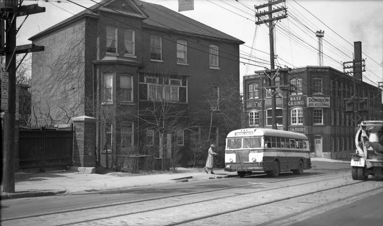 Roseland Bus Lines Ford 19B on Roselands route is in front of the Subway Hotel on Keele Street in the Junction. It will back around onto Vine Avenue, then swing left to go north on Keele under the subway (underpass) beneath the C.P.R. West Toronto yard. It will then proceed via Weston Road to Mount Dennis and Roselands. Streetcar tracks are those of the T.T.C. used by the Weston Road cars whose terminal was slightly to the rear of the photographer. April 1953. J.V.Salmon Collection Toronto Public Library Baldwin