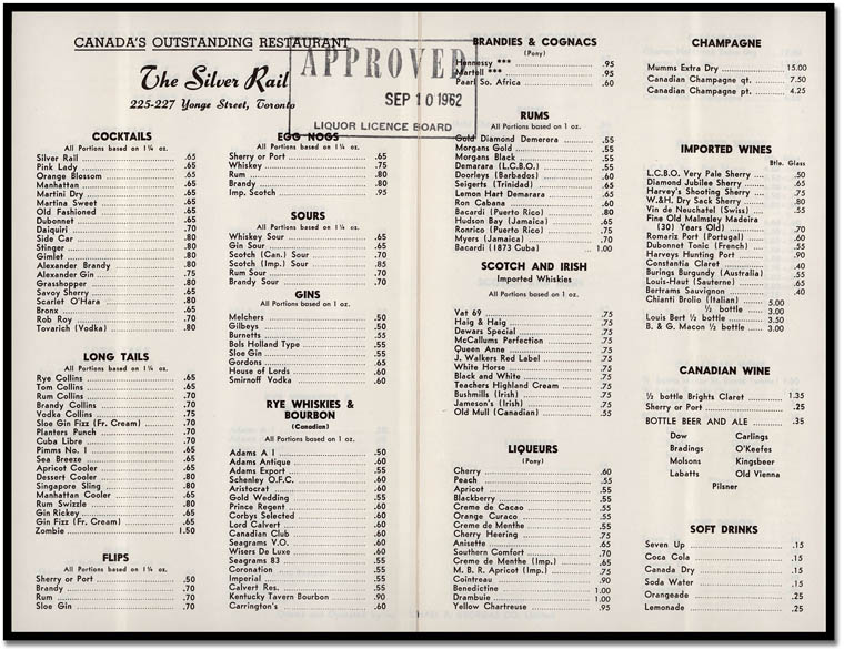 The Silver Rail Tavern The newly-built Silver Rail was among the first seven bars in Toronto permitted to sell liquor by the glass when on Thursday, April 3, 1947 new laws came into effect. People had been drinking beer and wine in licensed tap rooms and hotel bars since 1933 but this was the first time since 1917 people were permitted to order a drink at a bar. The War Measures Act brought about a Canada-wide prohibition to prevent impairment of its men. Others included lounges in the Royal York Hotel, Barclay Hotel and Windsor Arms as well as the Club Norman on Adelaide Street East where 2,300 people filled it on the first night!