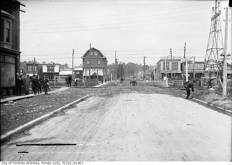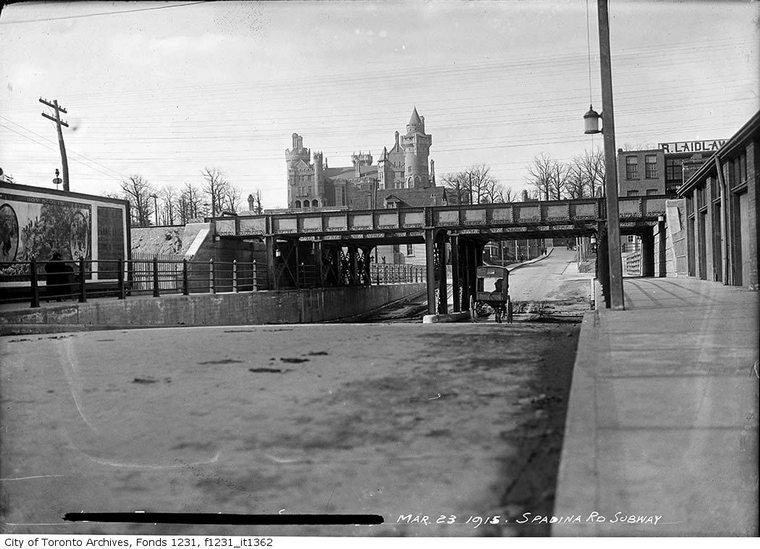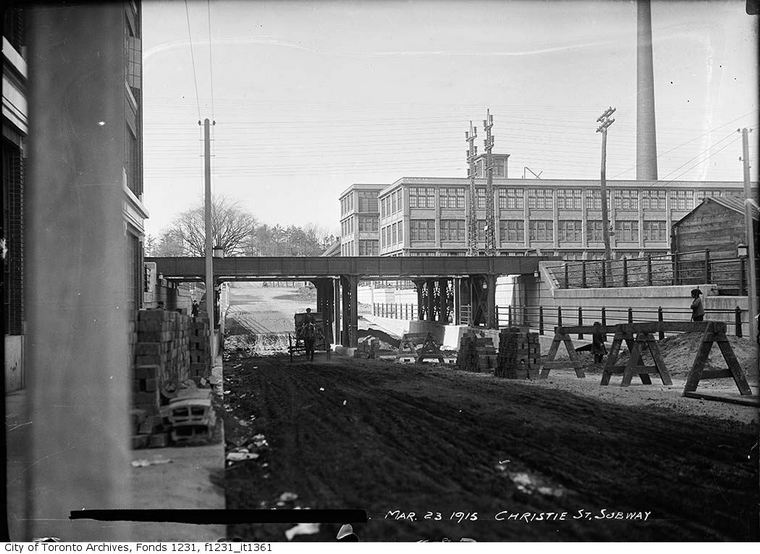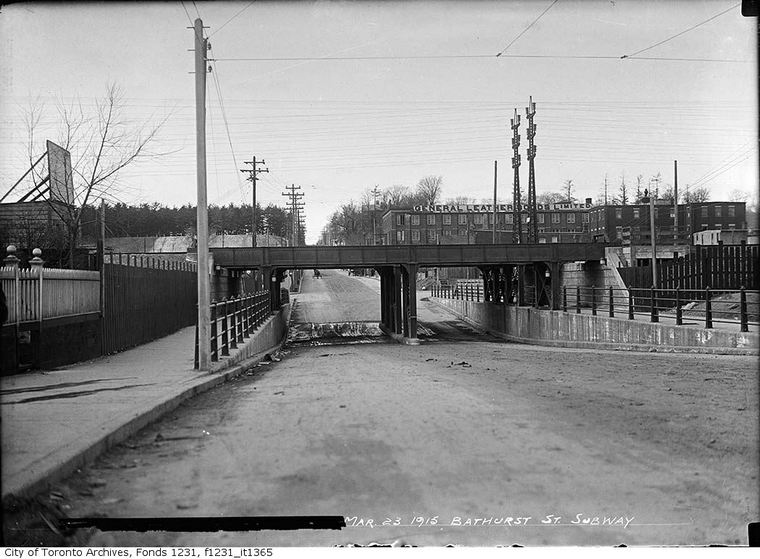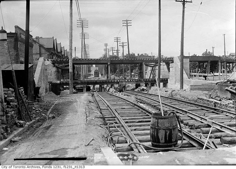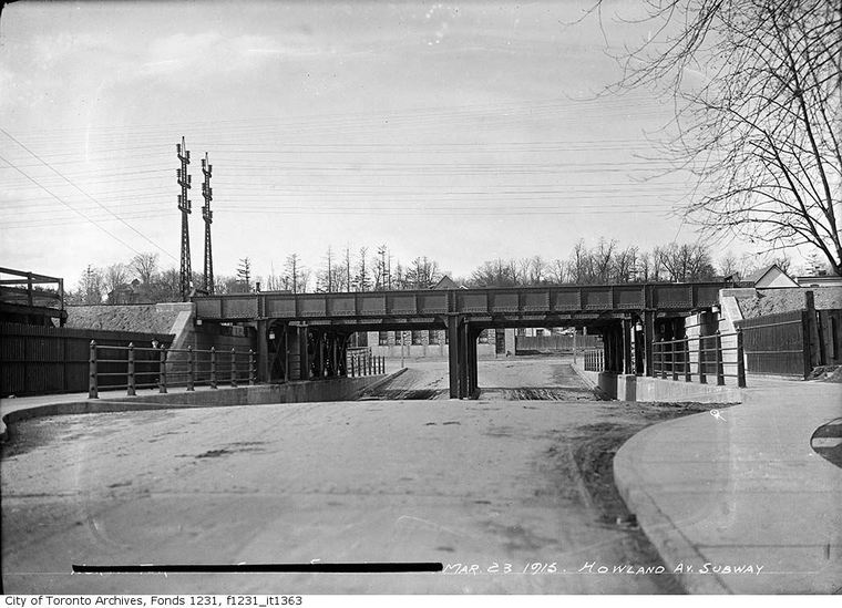 Grade Separation Prior to the huge Viaduct project along the Toronto waterfront another major grade separation project took place years before in North Toronto from 1912 to 1917. It involved ten subways, or underpasses as they are now called, to eliminate level crossings of streets along the North Toronto Subdivision between West Toronto and North Toronto. Some crossings were closed and others remained as level crossings including Dufferin, Lansdowne and Symington which in later years were underpassed, while two level crossings still remain; Bartlett and Osler. Subways Yonge Street, Avenue Road, Davenport Road, Spadina Road, Howland Avenue, Bathurst Street, Christie Street, Shaw Street, Ossington Avenue and Dovercourt Road. All are 66 feet wide. Yonge Street