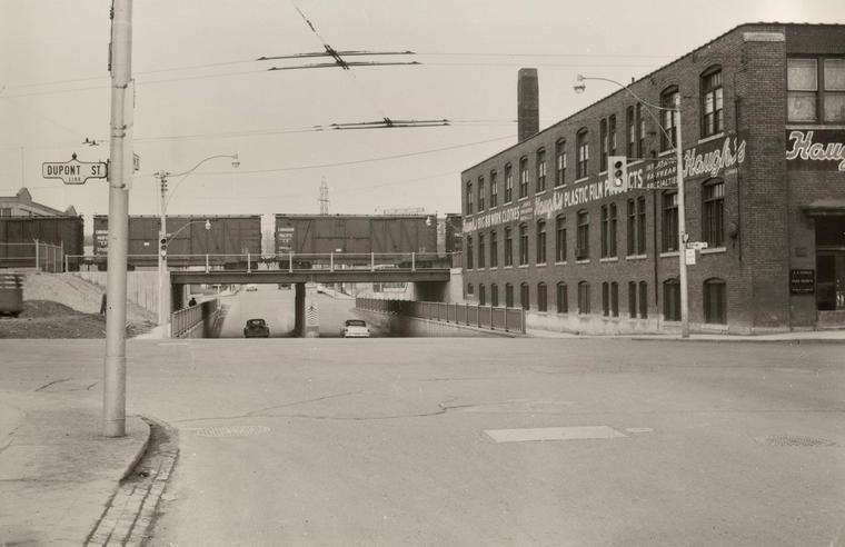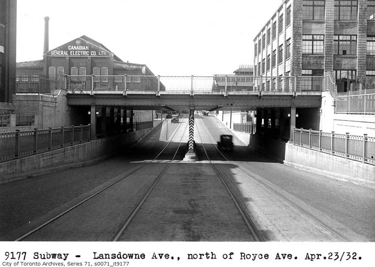 Looking north just north of Royce Avenue, later re-named Dupont Street. Vast CGE Lansdowne Works fills the scene including distant far right the former Canada Foundry boiler plant. Alfred Pearson/TTC collection Opened July 5, 1931. |