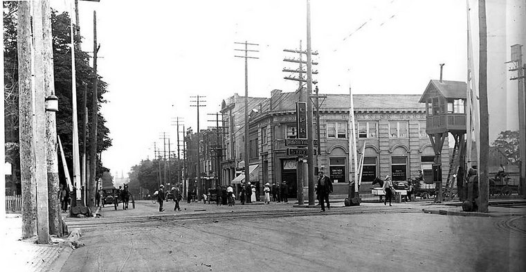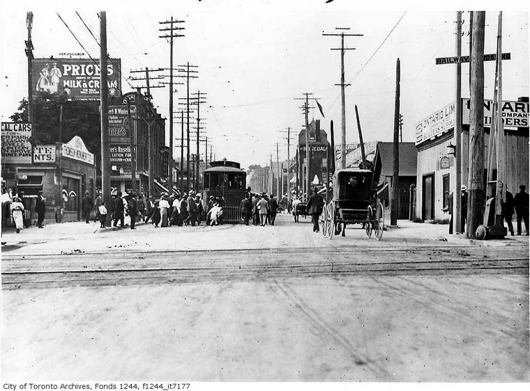 Yonge Street level crossing at City Limits, looking north. Note radial car and terminal at left. c.1912