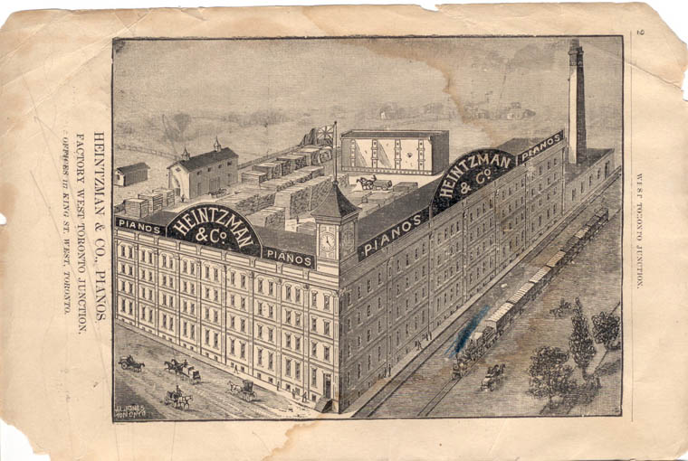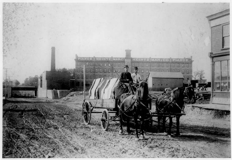 Horse drawn piano delivery wagon on unpaved dirt road. Looking north