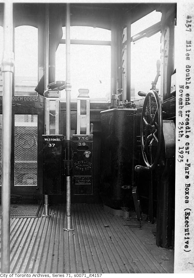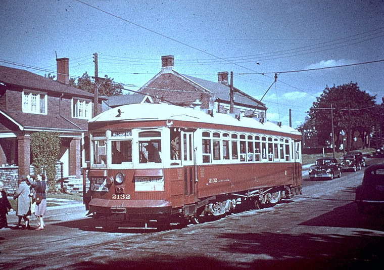 route at Humber Street. It will return south from here. Only Class H-1 Niles double ended cars 2128-2158 were used on this line. Note the railway-style walkover seats, easily reversed. They had double fare boxes, one for the TTC Keele route portion and the other for the York Township Weston route. They operated until September 13, 1948 when they were replaced by trolley coaches (buses). While the City Limit was at Northland Avenue the fare zone was actually a few short blocks farther north at Avon Crescent opposite Rogers Road for convenience in transferring between systems. Some St.Clair cars operated on Weston Road as far as the Avon Loop at least during the PM rush hours and did so for about 20 years after trolley coaches were introduced. This would serve the large number of workers leaving the Acme Screw & Gear plant. CNR continued to operate 7 1/2 miles from Weston to Woodbridge until abandonment May 10, 1926 after which Roseland Bus Lines operated the service until they were taken over by the TTC on January 1, 1954 along with West York Coach Lines and other independent companies.