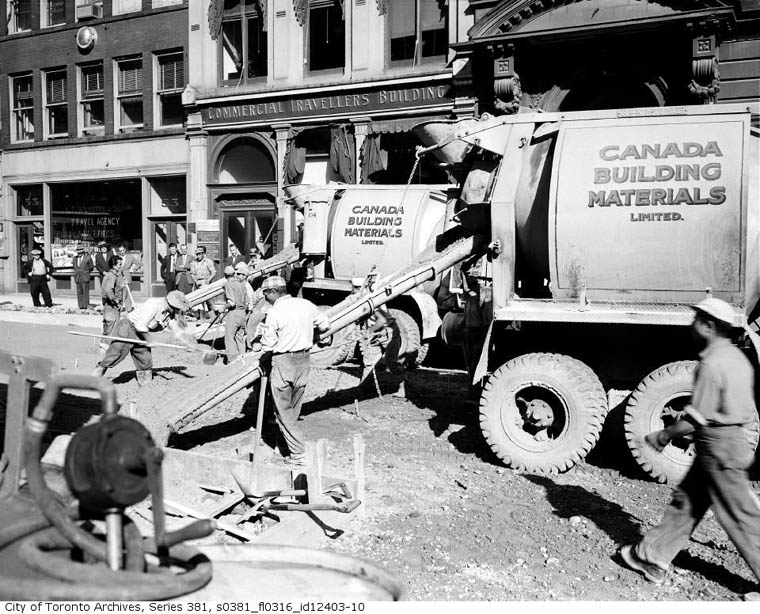 Looking north from Temperance Street, two blocks south of Queen Street. Always a main street in Toronto it has long been a busy thoroughfare one that first used horse drawn streetcars and omnibuses to transport people; and later, electric streetcars and radial cars to reach outlying areas. Buses and highway coaches came along as well as private automobiles and taxis. Eventually, a subway was built under and beside it.
