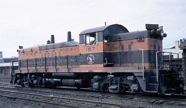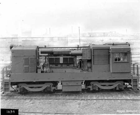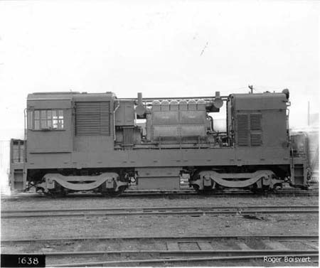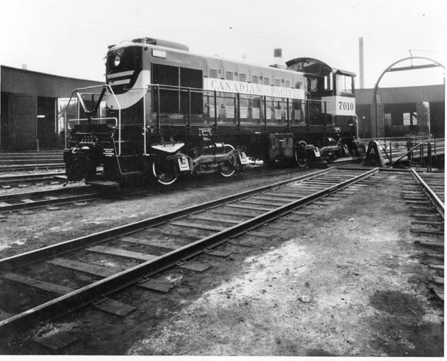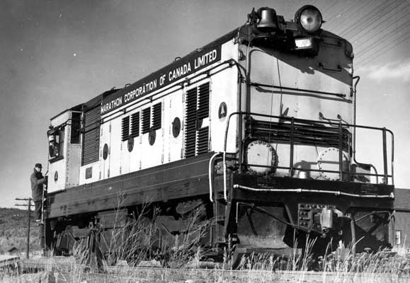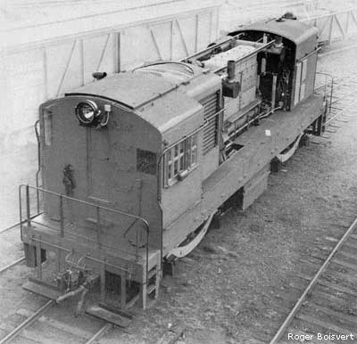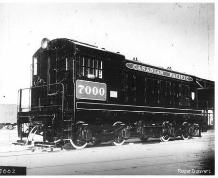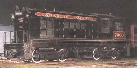 of train #346 to Guelph Jct. 9006 built August 1931 by Ottawa Car Manufacturing Co. Ltd. Ottawa, to designs of Electro-Motive Corp. Cleveland, Ohio, with an 8 cyl. 400 HP Winton gasolene engine and Westinghouse electrical equipment. Combination baggage-coach with a 15'10" engine room, a 20' 2 1/2" baggage room, 8'9" smoking compartment with 14 seats and a 23' 4" passenger compartment seating 36, total 50 psgrs. 72'0". Weight 142,000 lbs. (152,000lbs. with diesel) It was first operated on Western Lines between Regina and Weyburn, Sask. (125 miles). It suffered a major fire in 1934. It was repaired and re-engined in 1935 with an 8-cyl. 400 HP Harland & Wolff diesel and operated in and out of Drummondville Que. Thus it became the CPR's first diesel powered unit two years ahead of the 7000. It was finally retired and scrapped in 1957. Unfortunately, no CPR car was preserved. 9006 after conversion to diesel CPR 7000 diesel locomotive was a custom built one-of-a-kind unit never repeated, using imported components from British Empire countries to avoid heavy Customs duties. Ordered in 1935 from Stone Franklin of Canada Ltd, Montreal it was built by National Steel Car Co. Hamilton using a 6cyl. 600HP diesel from Harland & Wolff, Belfast, Northern Ireland with electrical equipment by Laurence Scott and Electromotors, Norwich, England. Its unique six position throttle provided only two operating speeds with a maximum of 30 mph. It weighed a heavy 245,000 lbs. It was delivered in November 1937 and operated in Hochelaga Yard, Montreal. Following delivery of five ALCO S2's in 1943 it was leased for 3 to 4 months to Marathon Paper Mills Ltd., Peninsula, (now Marathon) Ont. and then sold to them in October 1944. It operated there without a number for many years being re-engined in 1951 with a 600 HP Caterpillar. It was retired following delivery of a used GE 70-tonner (#30178 6/49 PGE 555), donated to the CRHA and remains at the CRM, shown below.