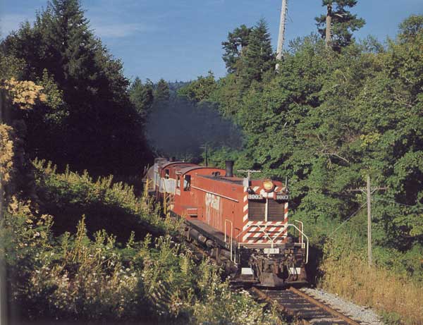 Cowichan with a long train of empty log flats. What If? In the "What if "category comes a number of things. First, the CPR had decided to "standardize" (something it rigorously followed) small road switchers for all work on the E&N, passenger, freight and yard. Five units were equipped with steam generators for passenger service. Only three were actually required but for the sake of better utilization (something essential considering the high cost of diesels) five were so equipped. It considered adding m.u. controls but in a typical CPR move this cost was cut. Multiple unit controls of a non-standard 21 pin type were finally added in the 1960's. Even more interesting is the fact that two or three units were considered to be equipped with A-1-A six wheel, four traction motor trucks to allow a higher speed (60 mph) on the light 65 pound rail of the Victoria Subdivision between Parksville and Courtenay. Again, in the interests of standardization it was decided to live with the lower 20 mph speed restriction until heavier rail could be laid. Another interesting "What If?" concerns the make of diesel chosen. The CPR was in a hurry to get the diesels and choose Baldwin over Alco as both Alco and EMD were backed up with orders. These were the first road units as the CPR had only bought Alco S2 1000HP yard switchers to this point. Had Alco been able to deliver the units sooner RS-1's would have been acquired instead. MLW was just beginning to build Alco design S2 switchers, so it is possible they could have built the RS-1's themselves. The CPR did later modify some MLW S4's with auxiliary fuel tanks to give longer range for road use as they had small tanks. They were over-worked (another typical CPR method) in this capacity and had to be replaced with proper road switchers of much higher horsepower. What the RS-1's might have looked like. Not considered was dynamic brakes. Perhaps not well understood in practical operating terms at the time such brakes would have been of great advantage on the many steep grades on the E&N. Diesels reduced the fires set by steam locomotives (even oil-fired) but fires continued never-the-less. These fires were due to brakeshoe use controlling speed down grades. When the old Baldwin's were finally retired in 1976 and replaced by GMD GP38's with DB it was suddenly "discovered" fires were greatly reduced. No doubt the cost of equiping the Baldwins with dynamic braking and their maintenance costs would have been saved many times over in brakeshoe and wheel wear and in reducing firefighting costs over a period of a quarter of a century. Otherwise, if EMD had been able to supply the CPR's needs it is likely NW5 1000HP road switchers would have been built for the E&N service instead.