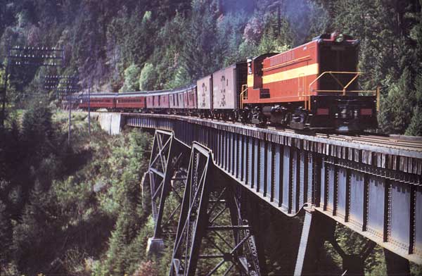 Cowichan with a long train of empty log flats. What If? In the "What if "category comes a number of things. First, the CPR had decided to "standardize" (something it rigorously followed) small road switchers for all work on the E&N, passenger, freight and yard. Five units were equipped with steam generators for passenger service. Only three were actually required but for the sake of better utilization (something essential considering the high cost of diesels) five were so equipped. It considered adding m.u. controls but in a typical CPR move this cost was cut. Multiple unit controls of a non-standard 21 pin type were finally added in the 1960's. Even more interesting is the fact that two or three units were considered to be equipped with A-1-A six wheel, four traction motor trucks to allow a higher speed (60 mph) on the light 65 pound rail of the Victoria Subdivision between Parksville and Courtenay. Again, in the interests of standardization it was decided to live with the lower 20 mph speed restriction until heavier rail could be laid. Another interesting "What If?" concerns the make of diesel chosen. The CPR was in a hurry to get the diesels and choose Baldwin over Alco as both Alco and EMD were backed up with orders. These were the first road units as the CPR had only bought Alco S2 1000HP yard switchers to this point. Had Alco been able to deliver the units sooner RS-1's would have been acquired instead. MLW was just beginning to build Alco design S2 switchers, so it is possible they could have built the RS-1's themselves. The CPR did later modify some MLW S4's with auxiliary fuel tanks to give longer range for road use as they had small tanks. They were over-worked (another typical CPR method) in this capacity and had to be replaced with proper road switchers of much higher horsepower. What the RS-1's might have looked like. Not considered was dynamic brakes. Perhaps not well understood in practical operating terms at the time such brakes would have been of great advantage on the many steep grades on the E&N. Diesels reduced the fires set by steam locomotives (even oil-fired) but fires continued never-the-less. These fires were due to brakeshoe use controlling speed down grades. When the old Baldwin's were finally retired in 1976 and replaced by GMD GP38's with DB it was suddenly "discovered" fires were greatly reduced. No doubt the cost of equiping the Baldwins with dynamic braking and their maintenance costs would have been saved many times over in brakeshoe and wheel wear and in reducing firefighting costs over a period of a quarter of a century. Otherwise, if EMD had been able to supply the CPR's needs it is likely