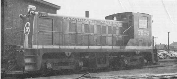 CN 7805 CLC-Whitcomb #2413 4/48 W.E.Miller Early diesels were for the most part yard switchers, a service where the greatest savings could be realized due to the low speed stop and go nature of yard switching. High availability was another factor in favour of diesels which could operate around-the-clock with little attention. A steam locomotive needed water about every four hours and once a day it had to be taken to the shop to get coal, have its fire cleaned and be greased and inspected. A replacement locomotive would be provided for three shift jobs using a "herder" or "scout" crew consisting of only an engineer and fireman, to exchange engines. This was a sought-after high seniority job. Diesels on the other hand could go for days on a tank of fuel oil and routinely went to the shop once a week for inspection and servicing. Aside from yard switchers, some of the earliest road locomotives were small units used on branch lines in isolated situations. Canadian National dieselized an isolated operation on Prince Edward Island. Here, smaller units were considered suitable due to the lack of heavy grades such as on the E&N. It chose 18 75-ton 650 HP units (CNR 7803-7820) built to Whitcomb Locomotive Works (Rochelle, IL) designs by Canadian Locomotive Company in Kingston. By this time Whitcomb was a division of Baldwin Locomotive Works. Ordered in February 1947, it was not until April 1948 that the first two units were delivered. Slow delivery of the units allowed time to evaluate them in operation, unfortunately frequent road failures due to defective engines resulted in the refusal to accept some units in use, to return those it had and to cancel the remaining 11 units. The Sterling diesel engine was an 8 cylinder 8x9 engine operating at 1200 rpm and rated at 650 horsepower. The unit itself was rated at 37,500 pounds t.e. and weighed 75 tons. It suffered from a poor design that failed in use. The units were sold by CLC to Whitcomb in January 1949. Whitcomb then re-engined the locomotives with 550 HP Caterpillar D-397 engines. Seventeen were re-sold to the Rock Island (1000-1016) where they performed satisfactorily with some lasting until 1970. The other unit was sold to the Washington & Old Dominion 55.