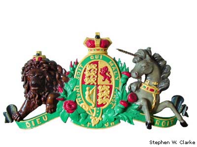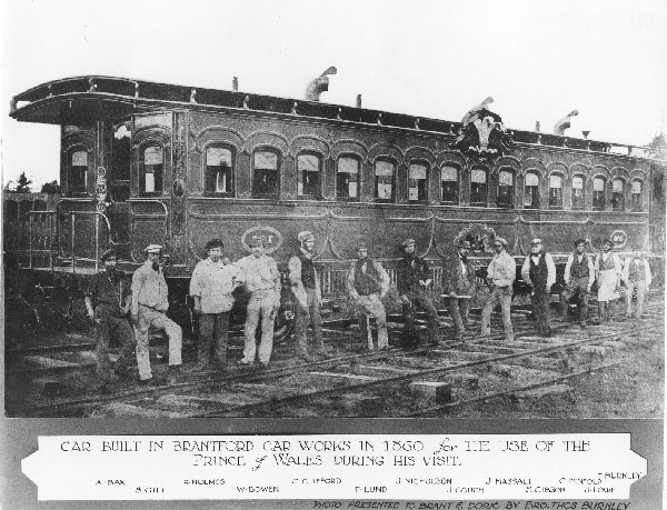 Dieu et mon droit (French for 'God and my right') is the motto of the Sovereign. The words were the military password chosen by King Richard I in 1198. The motto appears below the shield on the Royal Coat of Arms. The original is in the posession of Brant Lodge No.45 in Brantford. (The following is an extract from the Toronto Star On Tuesday 17th March 1936, and Saturday March 22nd 1936) Here, There, Everywhere (By F. D. R.) The Toronto Star Weekly devotes an editorial to "The First Sleeping Car" and quotes the following from the St.Catharine Standard "In the book, 'Trains of Recollection', as told by D. B. Hanna to Arthur Hawkes, there is an interesting statement to the effect that the first Pullman car was built at Brantford for the Prince of Wales on the occasion of the visit to Canada of H.R.H., later King Edward the Seventh. In 1860. Pullman quickly copied the idea, secured a monopoly and became a multi-millionaire. There is a memorial in Brantford to the inventor of the telephone; there should be one to the forgotten inventor of the Pullman." Continuing, the Star points out that Pullman built his first completely equipped car in 1863 at a cost of $18,000 and that the "Canadian car was built in 1859 at the Brantford shops of the, Buffalo and Lake Huron Railway Company. There is a picture of it in Reville's 'History of Brant County,' the distinguishing marks on the outside being a re- production of the Royal coat-of-arms at the centre, with the Prince of Wales' 'feathers' carved in wood at the top centre above." After quoting from the work mentioned, the Toronto paper adds: "The Brantford History gives the names of thirteen men who built the car. No doubt the name of the man who conceived it is known. If it is true, as claimed, that this was the first sleeper in actual operation, there should, as suggested, be some memorial to that fact in the Telephone City." That this then novel method for more comfortable night travel on trains originated in Brantford is just as certain as the inception of the telephone here, but in both instances our neighbors across the border make the absolutely untrue claim of priority. The order for a special car to accommodate the future King on his visit to Canada in 1860 was placed with the Brantford shops in 1859 and the idea of introducing sleeping bunks was evolved in the designing department. Thomas Burnley, whose son A. B. Burnley still resides here, had charge of the construction and the others employed on the job were A. Box, S. Gill, R. Holmes, W. Row-an, G. Clifford, F. Lundy, J. Nickelson, G. Couch, J. Hassall, J. Gibson and C. Penfold, while C. Lowes carved the feathers. It was a picked lot of men who were entrusted with the task and they made such a good job of it that people from a wide area came to see the result of their labors. One of these was George M. Pullman, who was then associated with the construction of frame railway depots in this part of Canada, and it is related that he manifested a particular interest in the novel idea of the sleeping arrangement. It was in the same year (1859) that Pullman took out his first U. S. patent and the significance of that fact would appear to be obvious. It is certain, and beyond any manner of dispute that Edward V1l, when Prince of Wales, and members of his entourage were the first to rest in bunks while traveling at night and that this pioneer "sleeper" was designed and built in Brantford. When the coach was ultimately dismantled Mr. Burnley secured the badge of the Prince SATURDAY, MARCH 21, 1936 In this column, recent reference- was made to a special car constructed at the railway shops, then located here, for the Canadian visit, in 1860, of the Prince of Wales, afterwards King Edward VII, and the fact emphasized that it possessed the first sleeping bunk accommodation ever recorded. In response to requests for a description of other features of this historic production the following information is taken from a file of the Weekly Expositor of the period named. The exterior of the car, which is 46 feet long by 10 feet wide, presents a splendid appearance. Each side is divided into five large panels, painted blue, and having sweeping moldings, edged with gold. In the centre panel is the Royal Arms, most exquisitely painted, and immediately over it the Coronet Of the Prince of Wales, elegantly carved, painted white, tipped with gold, the shield enriched with decorations in gold, and bearing the motto of the Prince of Wales, lch Dien. The car has a double roof for the purpose of, thorough ventilation, the upper one being supported by beautifully cut gilt brackets. The window frames are made of handsome Canadian oak, and are richly varnished. Each end panel is elegantly ornamented with an oval garter, containing the name of the Company, while the centre has "No. 1" inscribed upon it, in well executed, ornamental letters. The handrails are of burnished brass, and rest upon polished oak tracks, which, with the iron work, are painted with the utmost skill and elegance. The inside of the car is chaste, tasteful and elegant, and must elicit the admiration and gratify the highly cultivated taste of the Prince and his suite. It is divided into three compartments, an ante-room 8 feet 6 inches. by 6 feet, a stateroom 28 feet by 8 feet 6 inches, and a retiring room, all furnished in the same style. The first is the anteroom, intended for one or more of the Prince's attendants. It is provided with two handsome lounges, and two novel but prettily formed and painted refrigerators. The inner walls of the car from one end to the other, are composed of beautifully curled maple panels, set in black walnut frames, surmounted by a neat and highly ornate cornice, edged with gold, and decorated with a light colored variegated head lining. The window curtains are of fine Canary silk, mounted on patent spring rollers and having silk tassels, by the slightest pull of which one can raise or lower the curtains at pleasure, and 