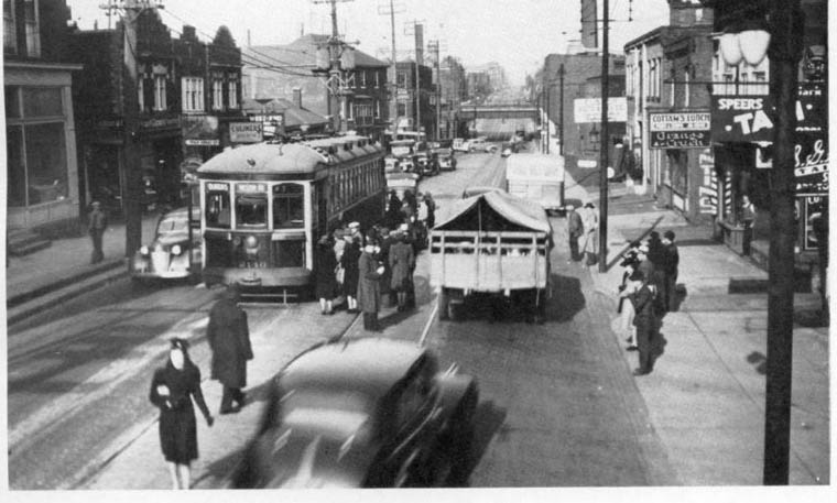 A busy street scene on Keele Street just north of Dundas Street with the subway in the distance. TTC 2140 a Weston Road car is changing direction. Note how dangerous this is with passengers loading in the middle of the street before crossing over to the north track. This was changed when a piece of property to the right was bought, buildings demolished to create an off street terminal. Just ahead of the tarped truck is a West York Coach Lines Eileen Avenue route bus waiting to begin its northward trip. In the distance to the left of a car turning north on Keele, appears to be a Roseland Bus Lines bus which has backed onto Vine Avenue to wye before heading north on its route. Speers Taxi is one of two located on the east side. They also operated a funeral home! They would drive you there one way or the other! At one time funeral parlors also operated ambulances before they were taken over by the municipality. November 9, 1940 TTC