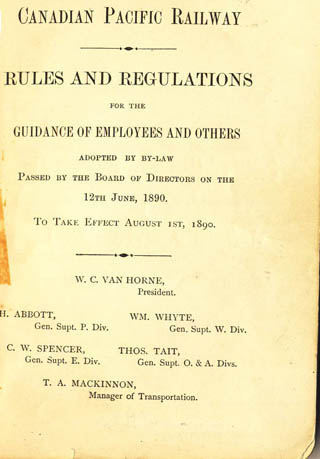 Rules & Regulations A LOOK AT A VERY OLD RULE BOOK One of the many interesting artifacts in the archives of Old Time Trains museum collection is an old C.P.R. rule book dated 1890 bearing the famous name of W. C. Van Horne, President.