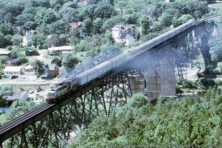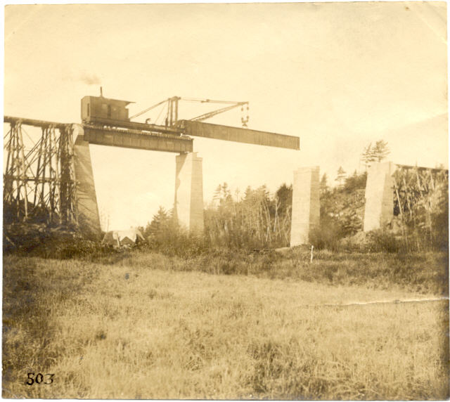 Bridge crane places section of Point Au Baril bridge. Collection of Doug Birchill, CPR Ret'd.