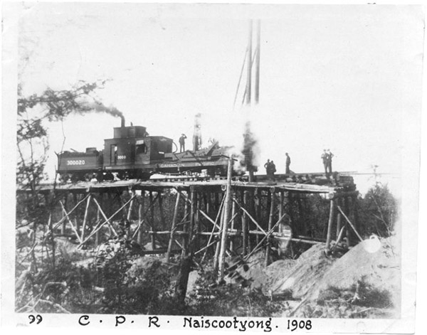 Lidgerwood dumping fill off trestle in Northern Ontario. Collection of Doug Birchill, CPR Ret'd.