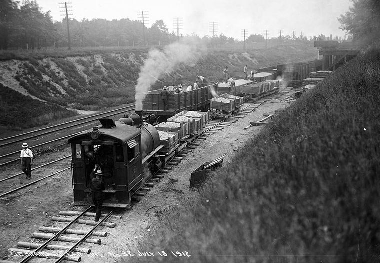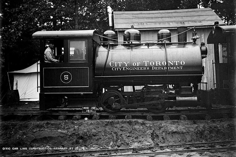 Toronto Civic Railways was created 1911 by the City of Toronto to provide service to expanding areas of the city not served by the Toronto Railway Company. The former Town of East Toronto was first to get a new streetcar line on Gerrard Street. Heavy construction projects in this era were done using temporary railway lines often narrow gauge and aided by steam shovels and much manpower. In this instance six 0-4-0T saddle tank steam engines, 40 dump cars and a Marion shovel along with track etc. were acquired in 1911 for less than $50,000! Official opening of the first line, Gerrard, took place on December 18th. 1912. The longest line was the Danforth route running 3.39 miiles between Broadview and Luttrell opening October 30, 1913.