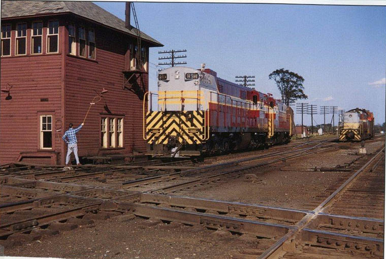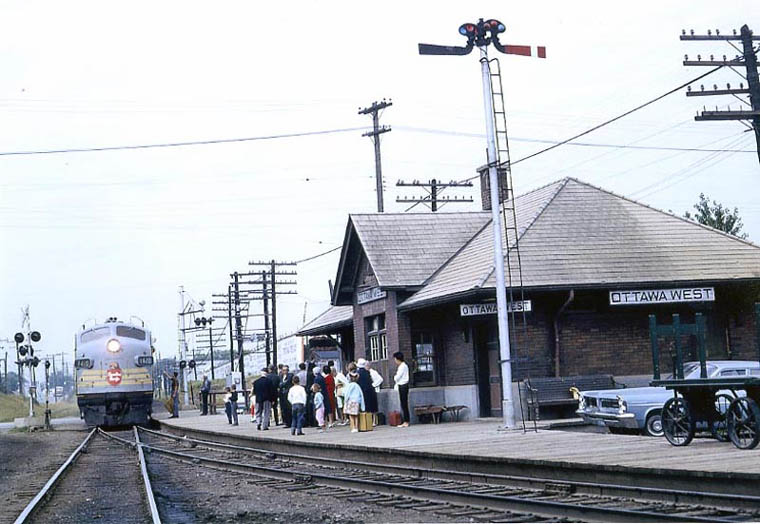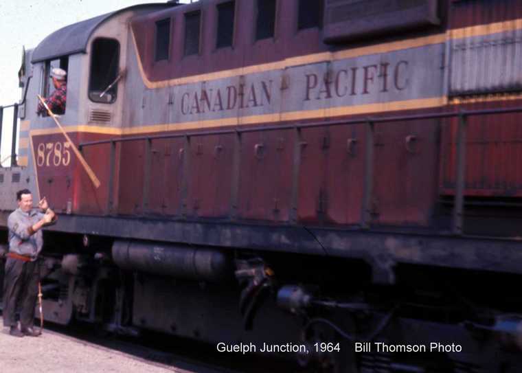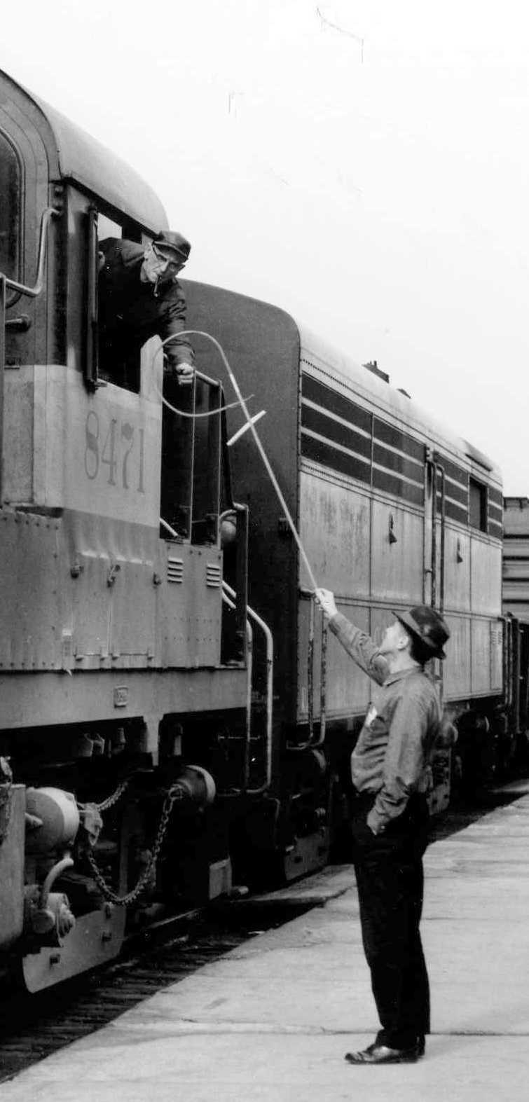 Bill Linley has slides of me hooping #4 (The Dominion) engine 1420 running about three hours late at Ottawa West on Saturday, July 31, 1965. I had a yellow flag in one hand, engineer's hoop in the other, and the staff with orders (clearance and a meet order) in its leather pouch around my neck to hand up to the conductor. Passengers were alarmed when the train did not stop. They were waiting for a train going in the opposite direction, the morning Brockville train No. 261 a Dayliner due in about ten minutes which made close connection with Pool 5 over CNR to Toronto. Eastbound No. 8 had a meet with westbound No. 261 due at Hull West at 8:45 A.M. Bill Linley/Bruce Chapman Collection