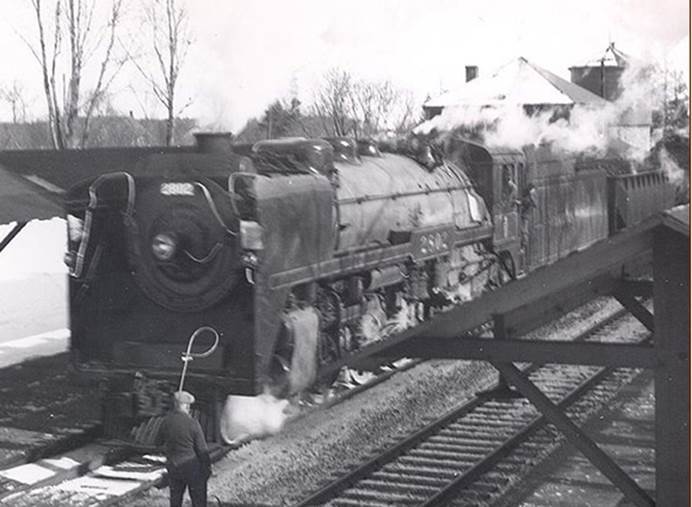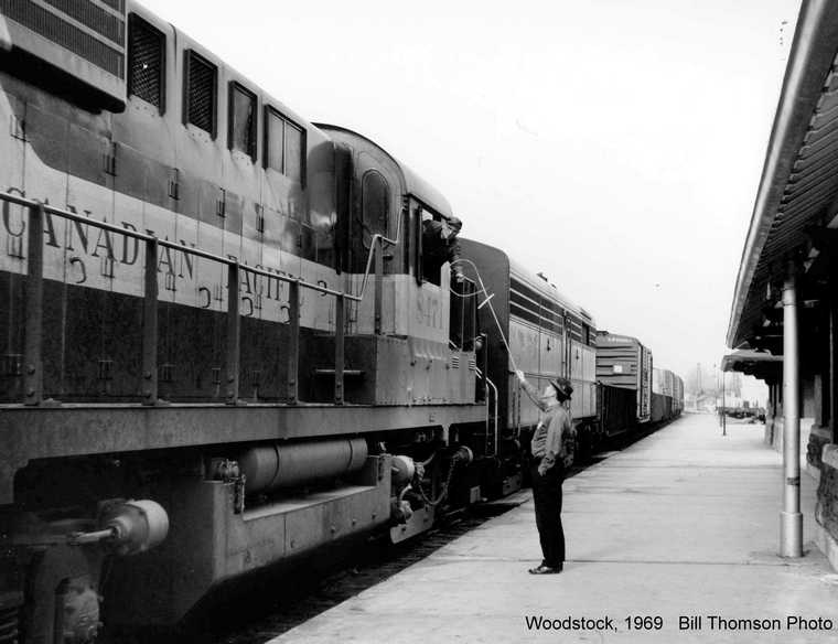 This shot is taken at beautiful downtown Stittville, mileage 13 on the Carleton Place Subdivision. Bill Linley took this shot of me hooping up orders to regular freight train #90 engine 8784 which ran from Smiths Falls through Carleton Place to Ottawa West. This was on Dominion Day 1965, my first year of employment as an operator. The train order signal at Stittville was only a 2-indication signal, red and green, meaning 'stop for orders' or 'proceed, no orders'. But if we only had train orders that did not restrict the train, a yellow flag by day or a yellow light by night had to be taken out with the train orders by the operator hooping the train, to let them know that they didn't have to stop. But holding 2 train order hoops and the flag sometimes got a little squeamish, so we'd often jam the yellow flag into the cracks in the wooden platform. That motorcycle on the platform was my transportation for the first year of my employment as an operator on the Smiths Falls Division. The town's real name is Stittsville, but a typo in an old employee's timetable meant that the error was carried on for years and years, until a short time before the line was ripped up. Bill Linley/Bruce Chapman Collection