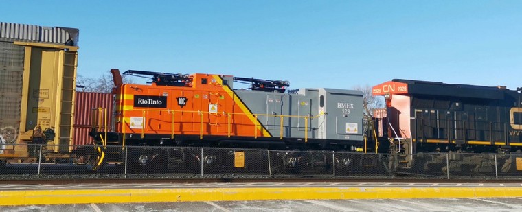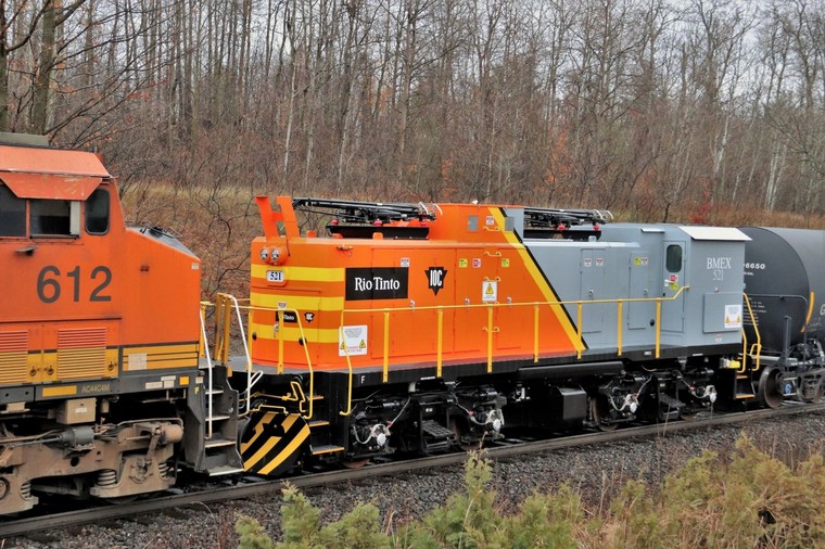 Labrador Carol Mine Railway (Iron Ore Company of Canada) A 5.7 mile long non-common carrier railway connects Canada's largest iron ore mine and concentrator with the QNS&L at Labrador City. It was the world's first fully automated railway. Brookville Equipment BL14EDC locomotives feature two heavy-duty pantographs equipped with ice cutting strips to remove buildup from the 2300VAC overhead catenary. The 1350-horsepower DC locomotives include newly-built frames and weigh 130 tons, measure 13 ft., 2 in. high, excluding the pantograph, 10 ft., 2-3/4 in. wide over handrails, and 45 ft. long. Additionally, the four-axle BL14EDC is equipped with a 4500-watt, 240VAC heater to provide sufficient capacity in the extreme operating climates. The locomotives will operate at a speed of 35 MPH and are geared for a maximum speed of 65 MPH.
