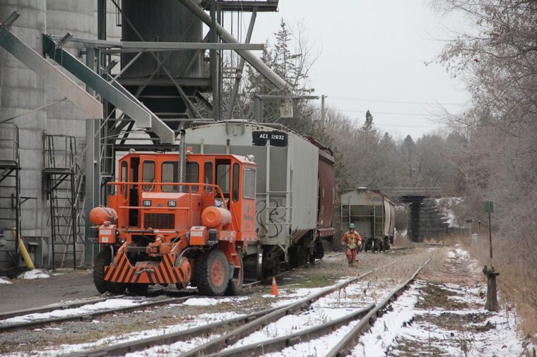 Rail King car mover switching on 7 car siding at Mile 32.18 old Marmora Sub. Note CN Kingston Sub. bridge in background. 11/30/2018 Darrell Lupson