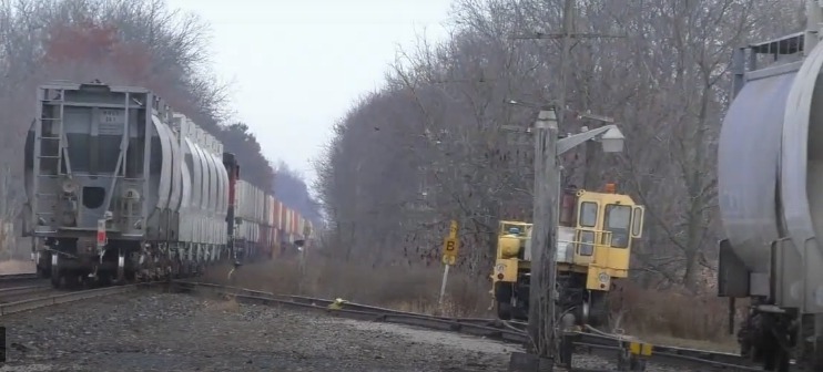 Stubbe's car mover sits in short private siding. CN 148 finishes passing