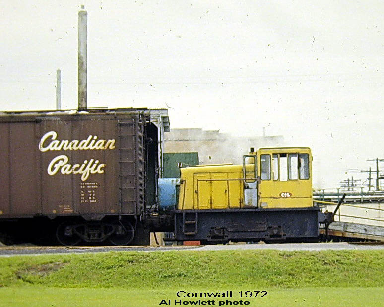 A standard 40-foot boxcar dwarfs this tiny dinky. 25-ton GE #32246 10/54 Originally Gaspe Copper Mines 1, became Noranda Mines Ltd. #1, acq. 12/62 by CIL in Copper Cliff and transferred 5/68 to Cornwall.