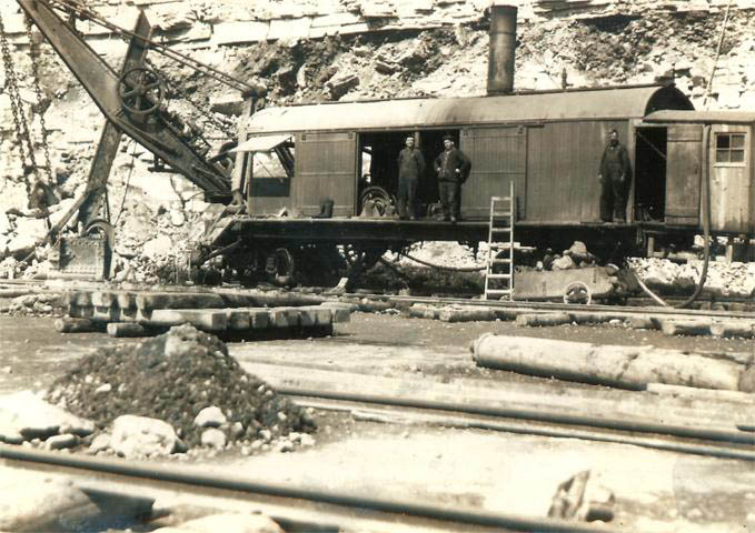 Very old photo of narrow gauge (3 foot) Plymouth dinky at work in the quarry at St.Mary's Cement. Also, steam shovel shown below digging limestone from Horseshoe Quarry. Circa 1915-20 Collection of Gordon Strathdee